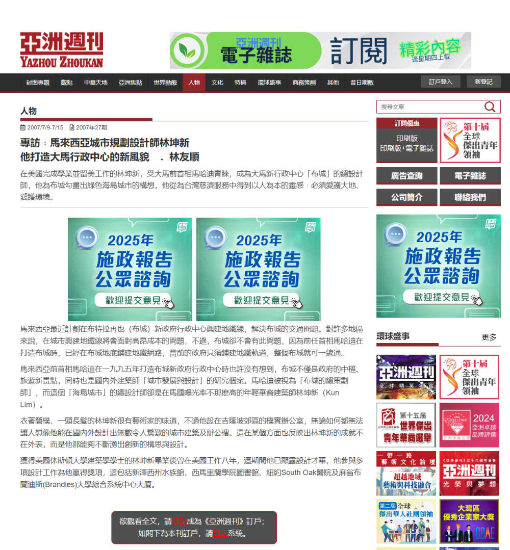 專訪﹕馬來西亞城市規劃設計師林坤新他打造大馬行政中心的新風貌 .林友順Media-Publications 專訪﹕馬來西亞城市規劃設計師林坤新 他打造大馬行政中心的新風貌.林友順 https://www.yzzk.com/article/details/人物 /2007-27/1366776784190/專訪﹕馬來西亞城市規劃設計師林坤新 2007年27期