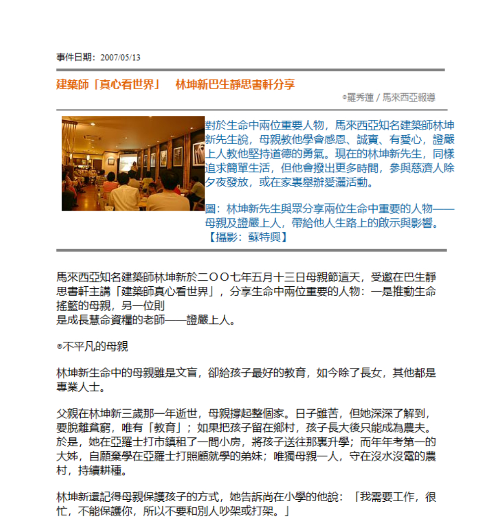 建築師「真心看世界」 林坤新巴生靜思書軒分享